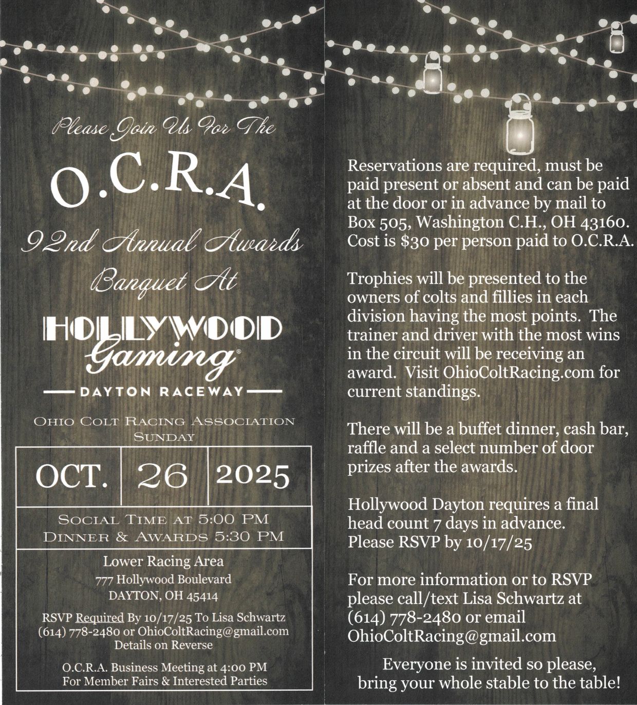 All of your hard work and dedication to the sport of harness racing has paid off. Make your reservations today to attend the 92nd annual awards banquet. Anyone and everyone is invited for a great evening of dining, awards and door prizes. Cost is $30 per person.
